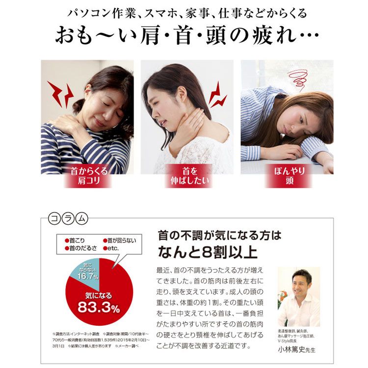 寝るだけでしっかり首をストレッチしながら、コリほぐしを実現した新方式「首のストレッチ+揉み玉構造」で、気持ちよく首を治療します。